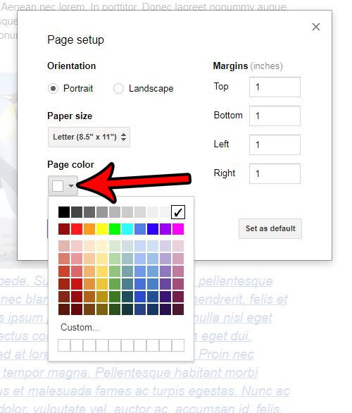 Étape 4: cliquez sur leCouleur de la pagebouton et sélectionnez la couleur souhaitée des pages de votre document. Une fois que vous avez terminé, cliquez sur leD'ACCORDbouton en bas de la fenêtre. La couleur de la page doit ensuite mettre à jour.