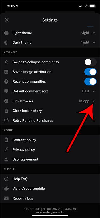 Les étapes de cet article vont vous montrer comment changer le navigateur utilisé par l'application iPhone Reddit lorsque vous cliquez sur un lien dans une publication.