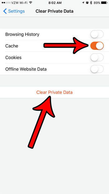 Étape 6 : Sélectionnez l'option de cache. Désactivez toutes les autres options pour lesquelles vous ne souhaitez pas effacer les données existantes. J'ai choisi de supprimer uniquement le cache dans l'image ci-dessous. Une fois que les paramètres correspondent à vos besoins, appuyez sur le boutonEffacer les données privéesbouton.