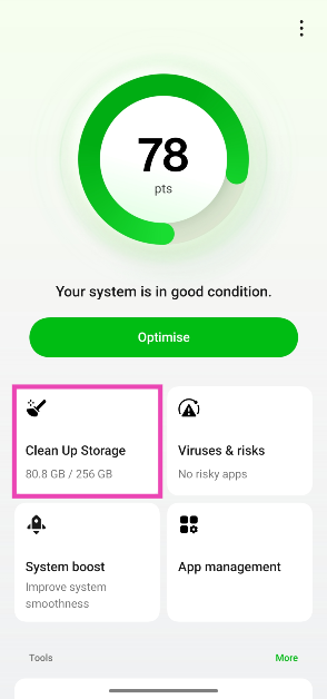 Pour supprimer la mémoire cache de toutes les applications de votre téléphone, accédez à l'application Phone Manager, appuyez sur « Nettoyer le stockage » et appuyez sur « Nettoyer » une fois l'analyse terminée.