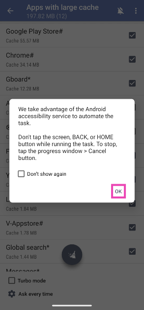 Étape 9 :Revenez à l'application 1Tap Cleaner et appuyez surD'ACCORD.