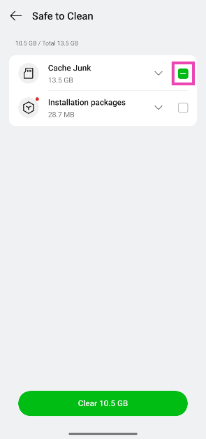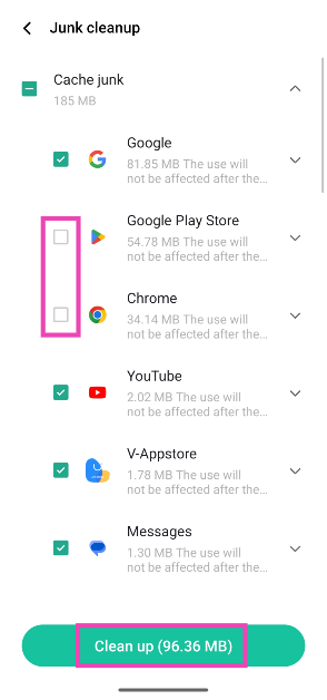 Étape 6 :Si vous ne souhaitez pas vider le cache d'une application particulière,développerleCache Junksection etdécochercette application.