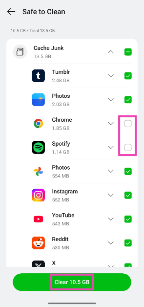 Étape 4 :Développez leCache junkcatégorie etdécocherles applications que vous souhaitez exclure.