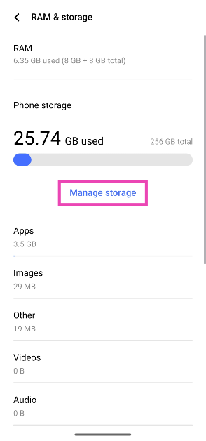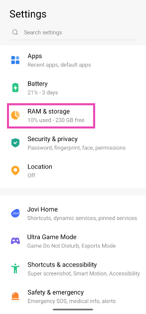 Étape 1 :Aller àParamètreset appuyez surRAM et stockage.