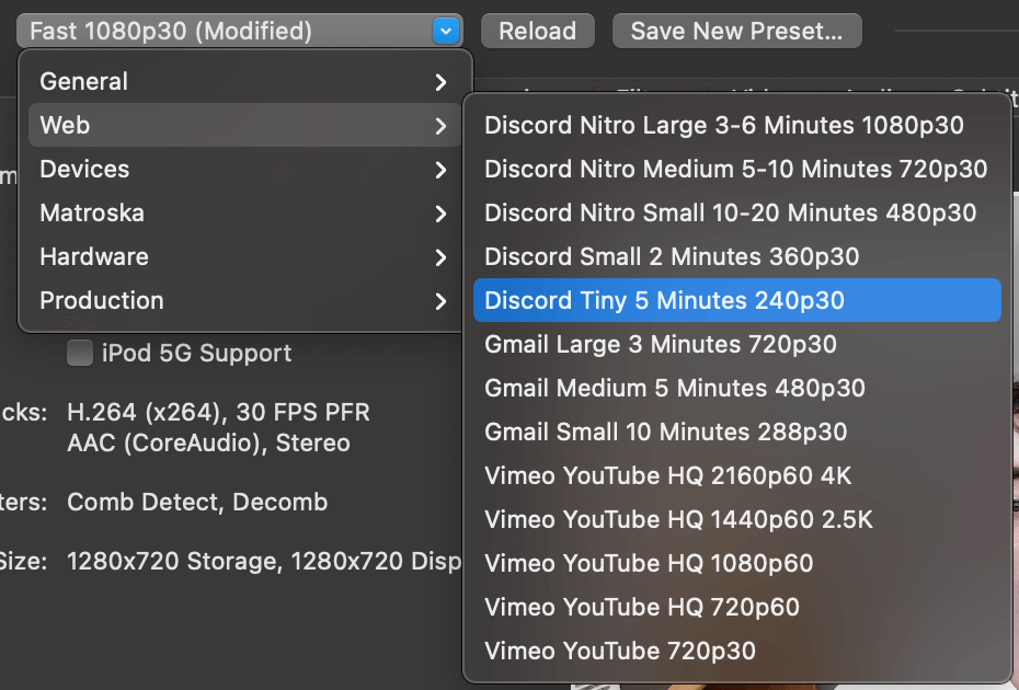 - Frein à mainest une application open source qui peut convertir et compresser des vidéos, avec des options de taille de fichier plus petite disponibles dans les préréglages Web.