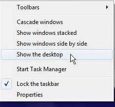 Procédez avec la création de votre dossier de bureau Windows 7 en affichant le bureau. Vous pouvez le faire rapidement en cliquant avec le bouton droit sur la barre des tâches en bas de votre écran, puis en cliquantAfficher le bureau.