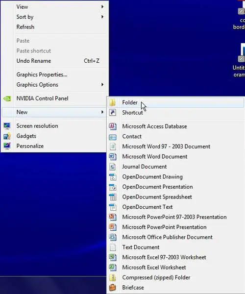 Cliquez avec le bouton droit dans n'importe quel espace ouvert sur votre bureau, cliquezNouveau, puis cliquezDossier.