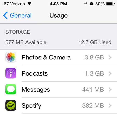 Ce menu est accessible en accédant àParamètres > Général > Utilisation. Par exemple, dans l'image ci-dessous, les podcasts sur mon appareil occupent 1,3 Go.