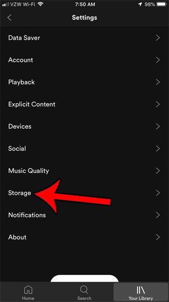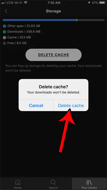 Vous pouvez vider votre cache Spotify d'un iPhone en ouvrantSpotify, en choisissant leMaisononglet, en appuyant sur l'icône d'engrenage, en choisissantStockage, en tapantDelete Cache, et puisDelete Cacheencore.