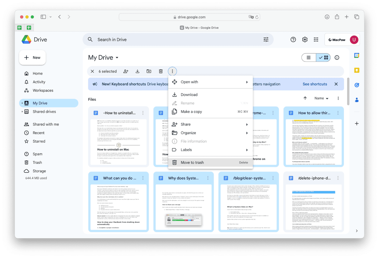 - Lorsque vous les avez tous sélectionnés, cliquez sur l'icône Corbeille dans la barre d'outils ou cliquez sur le bouton Plus (trois points) à droite de l'un des fichiers et choisissez Déplacer vers la corbeille/la corbeille.