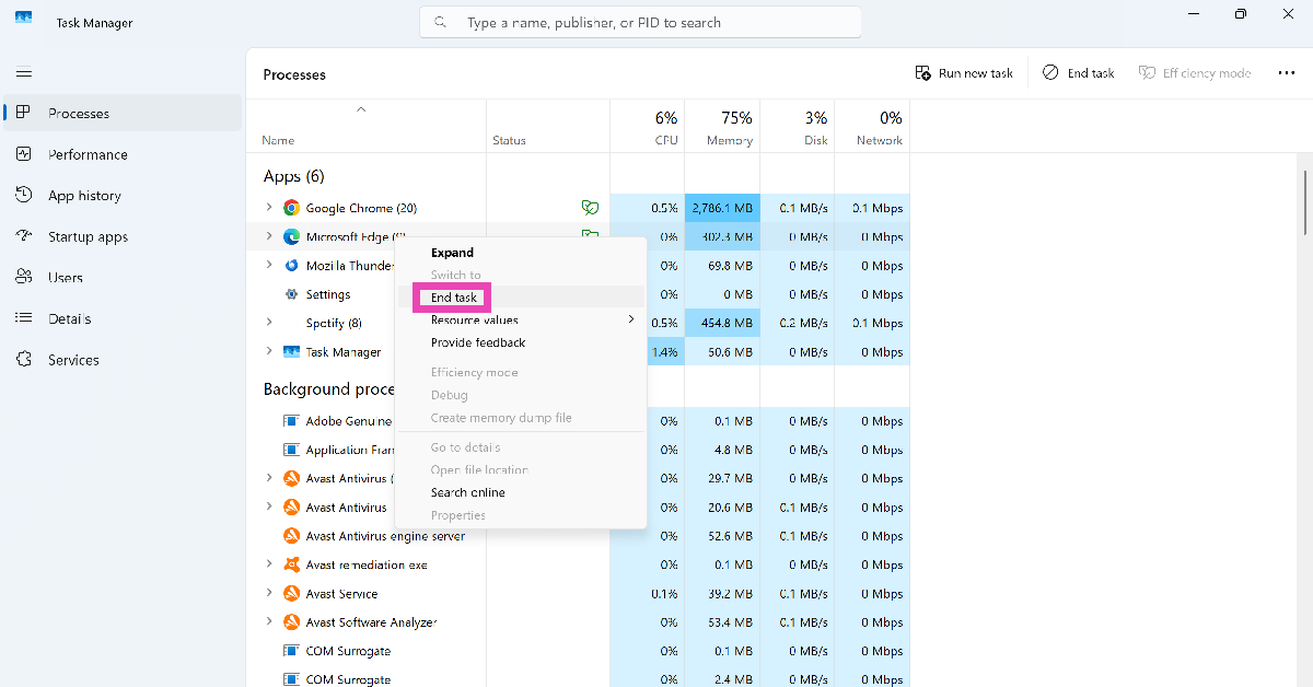 Étape 2 :Cliquez avec le bouton droit sur l'entrée de Microsoft Edge et appuyez surFin de la tâche.