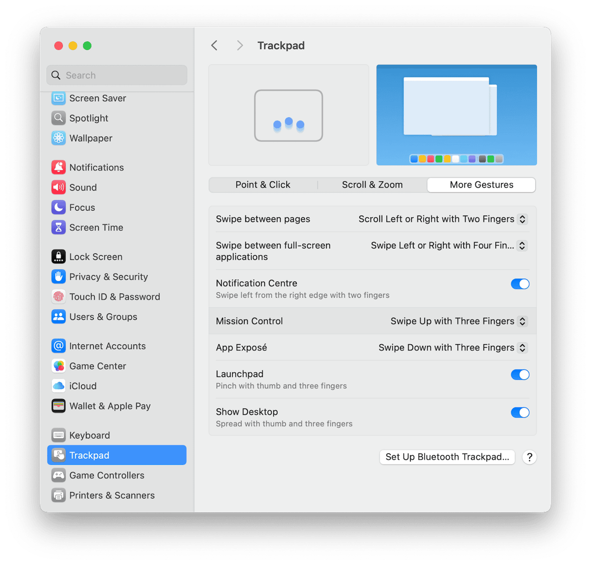 J'ai désactivé les balayages à trois doigts dans Paramètres système > Trackpad > Plus de gestes, afin de ne pas ouvrir Mission Control sans le savoir et créer accidentellement de nouveaux bureaux à tout moment.