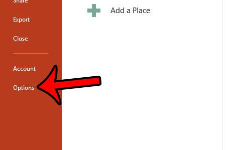 Étape 3 : Cliquez sur lePossibilitésen bas de la colonne sur le côté gauche de la fenêtre. Cela ouvre une nouvelle fenêtre intituléeOptions PowerPoint.