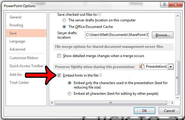 Étape 5 : Faites défiler vers le bas de ce menu, puis cochez la case à gauche deIncorporer les polices dans le fichier. Si d'autres personnes visualisant le fichier doivent le modifier, il est préférable de sélectionner également leIntégrer tous les personnagesoption dans cette section. Vous pouvez ensuite cliquer sur leD'ACCORDbouton en bas duOptions PowerPointfenêtre pour la fermer et appliquer vos modifications.