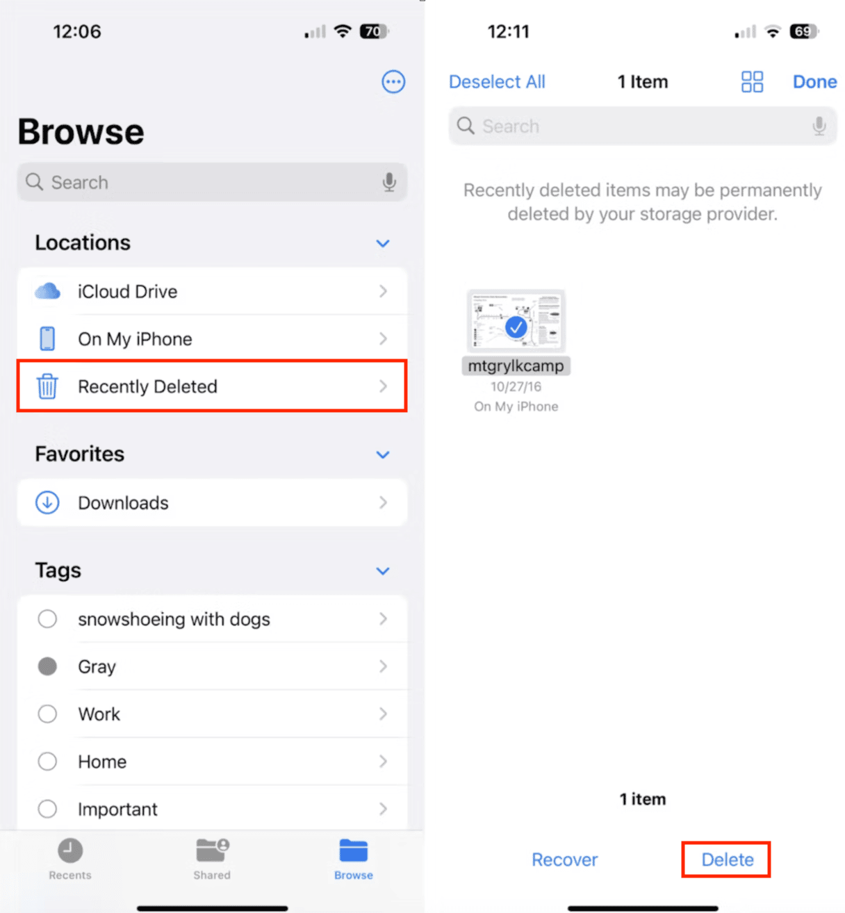De nombreuses applications conserveront les fichiers supprimés pendant 30 jours maximum, ce qui vous procurera une tranquillité d'esprit si vous supprimez accidentellement quelque chose. Si vous souhaitez libérer de l'espace de stockage maintenant, vous pouvez nettoyer virtuellement votre iPhone en supprimant définitivement ces fichiers vides, également appelés « corbeille ».