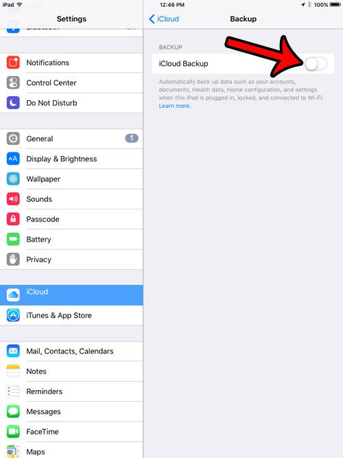 Étape 5 : Appuyez sur leD'ACCORDpour confirmer que vous souhaitez activer la sauvegarde iCloud pour votre iPad et que vous comprenez que cela désactivera la sauvegarde automatique qui se produit lorsque vous connectez votre iPad à votre ordinateur.
