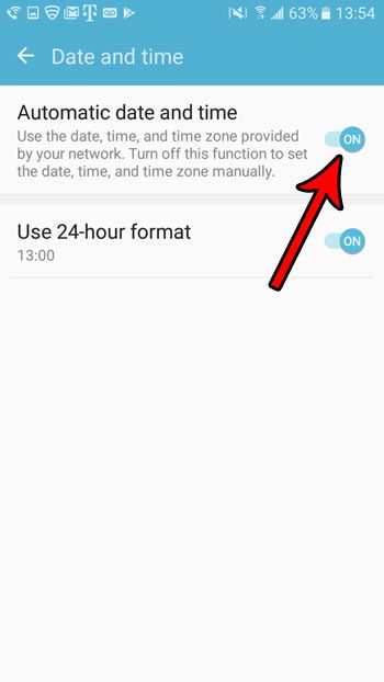 Étape 4 : Appuyez sur le bouton à droite deDate et heure automatiques. Notez que cela fera disparaître le reste des options manuelles de date et d’heure de l’écran. Votre écran devrait ressembler à celui ci-dessous lorsque vous avez activé l'heure basée sur le réseau sur votre téléphone Android.