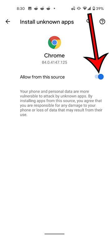 Dans l'image ci-dessous, j'autorise l'installation d'applications à partir du navigateur Chrome sur mon Pixel 4A. Notez la clause de non-responsabilité sur cet écran qui indique qu'en installant des applications à partir de cette source, vous acceptez d'être responsable de tout dommage causé à votre téléphone ou de toute perte de données pouvant résulter de leur utilisation.