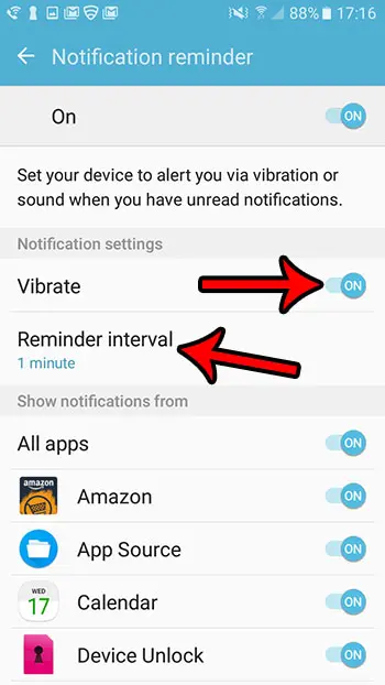 Étape 6: Allumez leVibreroption sousParamètres de notificationSi vous souhaitez que le rappel de notification vibre.