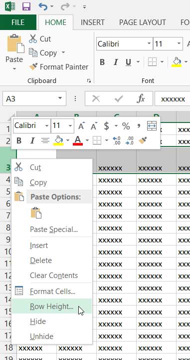 Vous pouvez également spécifier numériquement la taille d'une ligne en cliquant avec le bouton droit sur le numéro de ligne, puis en cliquant sur le boutonHauteur de rangéeoption.