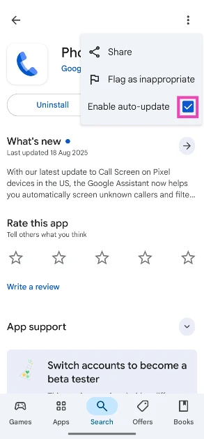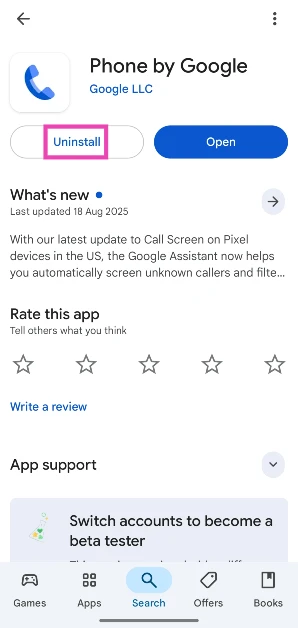 Bien qu'il n'existe pas encore de moyen de passer à l'ancienne conception, vous pouvez restaurer la version précédente de l'application Téléphone en désinstallant la nouvelle mise à jour. Accédez au Google Play Store, recherchez « Phone by Google », appuyez sur le résultat et cliquez sur « Désinstaller ». Assurez-vous d'appuyer sur les points de suspension et de désélectionner également « Activer la mise à jour automatique ».