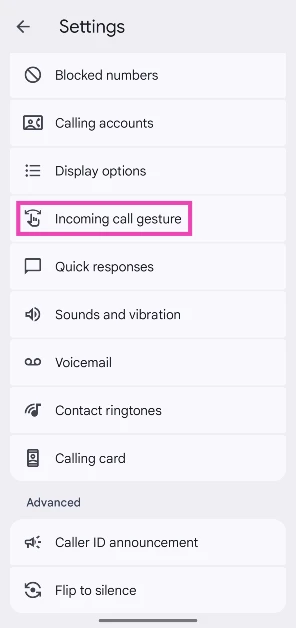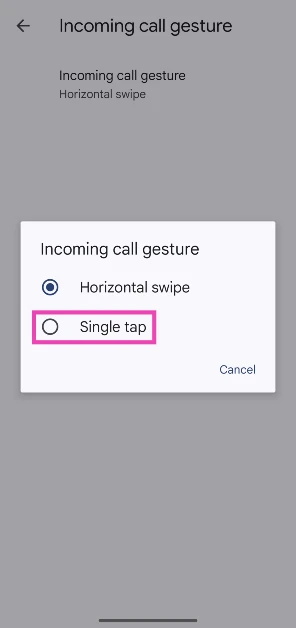 Lancez l'application Téléphone, appuyez sur le menu hamburger, accédez àParamètres> Geste d'appel entrant, appuyez sur « Geste d’appel entrant » et sélectionnez « Appuyez une fois ».