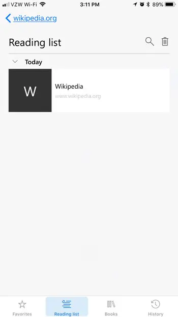 Notez que vous pouvez effacer toute votre liste de lecture en appuyant sur l'icône de la corbeille en haut à droite de l'écran. Vous pouvez également supprimer une page individuelle de cette liste en la faisant glisser vers la gauche, puis en appuyant sur le boutonSupprimerbouton.