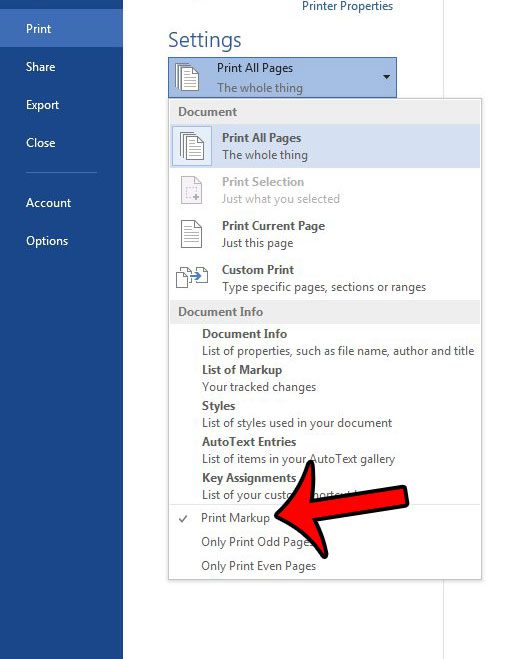 Étape 5 : Cliquez sur leImprimer le balisageoption en bas du menu pour supprimer la coche. Votre document dans le volet de visualisation doit être mis à jour pour montrer à quoi ressemblera le document sans le balisage imprimé.