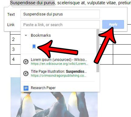 Étape 3 : Sélectionnez leSignetslien déroulant, puis cliquez sur le signet que vous avez créé. Vous pouvez ensuite cliquer sur leAppliquerbouton pour créer le lien.