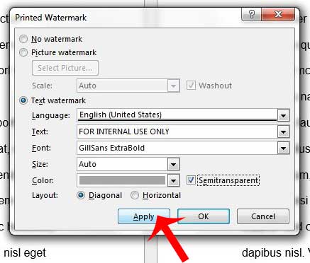 Étape 6 : modifiez les options de police, de taille, de couleur et de mise en page selon vos besoins, puis cliquez sur le boutonAppliquerbouton pour l’ajouter au document. Notez que vous souhaiterez peut-être décocher la caseSemi-transparentsi vous trouvez que le filigrane est trop difficile à lire. Vous pouvez ensuite cliquer sur leFermerbouton pour fermer cette fenêtre.