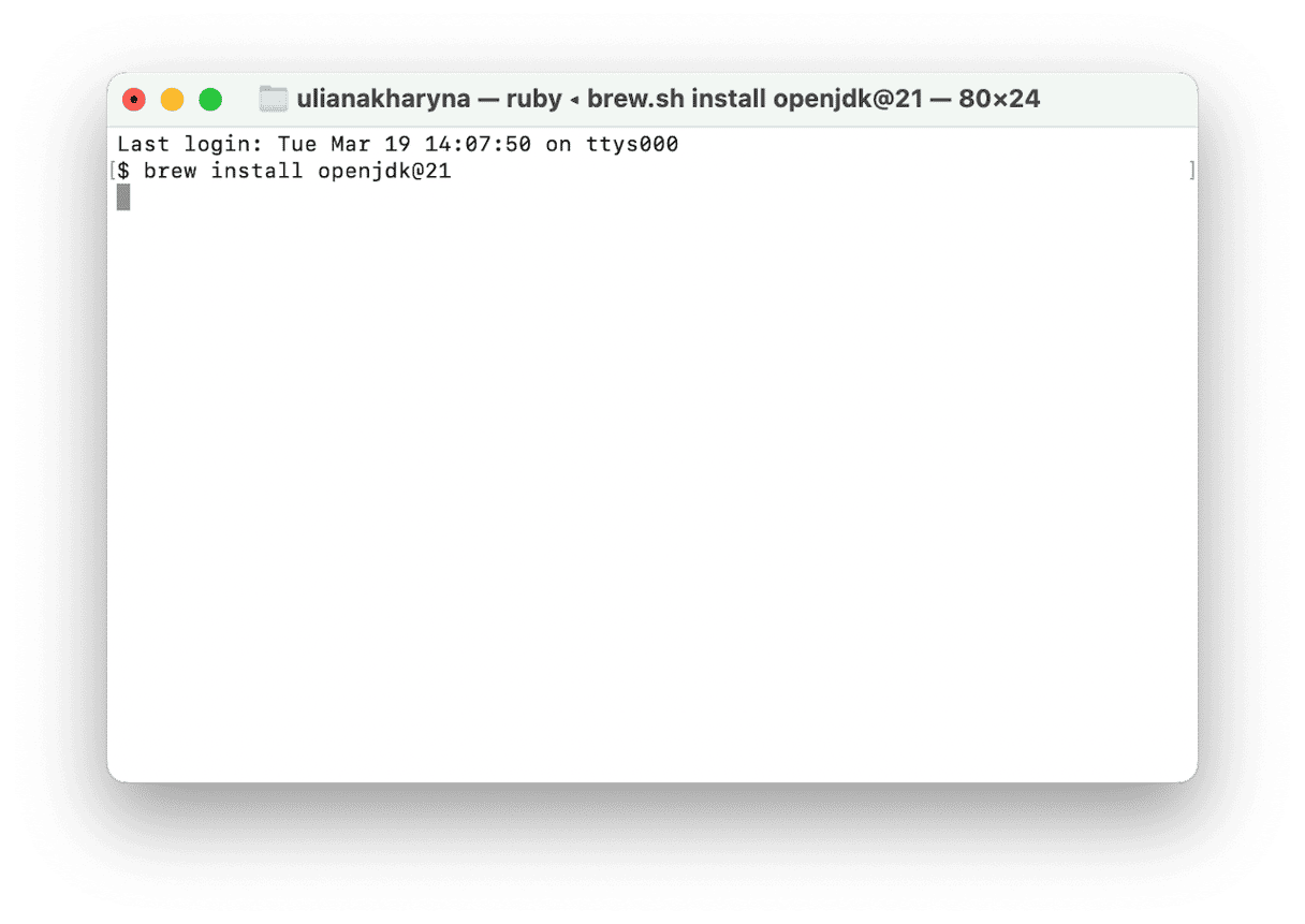 brew install openjdk@suivi du numéro de version de la version d'OpenJDK que vous souhaitez installer. Par exemple, pour la version 21, ce seraitbrew install openjdk@21 - Appuyez sur Retour et attendez la fin de l'installation.