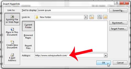 Étape 6 : Cliquez dans le champ d'adresse en bas de la fenêtre, appuyez surCtrl + Vpour coller l'adresse Web que vous avez précédemment copiée, puis cliquez sur le boutonD'ACCORDbouton en bas de la fenêtre.