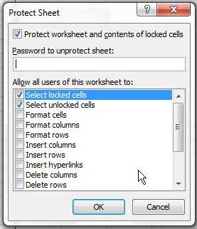 Étape 6 : Tapez un mot de passe qui sera nécessaire pour modifier ou déverrouiller la ou les cellules verrouillées dans le champ en haut de la fenêtre, puis cliquez sur le boutonD'ACCORDbouton en haut de la fenêtre. Par défaut, les spectateurs de votre feuille de calcul pourront uniquement afficher et sélectionner vos cellules verrouillées. Cependant, vous pouvez cocher des options supplémentaires dans cette fenêtre si vous souhaitez également leur permettre d'effectuer d'autres modifications.