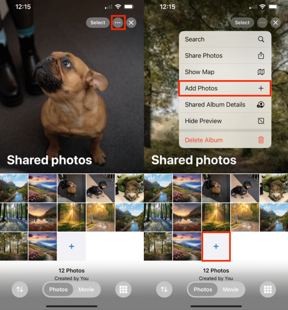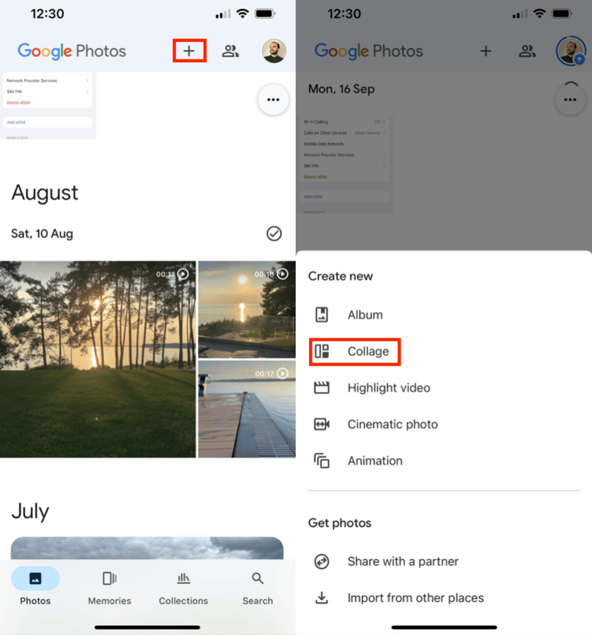 - Appuyez sur les trois points dans le coin supérieur droit, sélectionnezAjouter des photos, et incluez les photos souhaitées dans votre collage. Vous pouvez également appuyer sur le signe plus pour ajouter des photos.