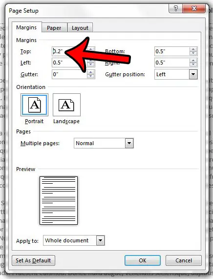 Cliquez à l'intérieur duHautchamp dans leMargeset entrez un nombre inférieur. Vous pouvez ensuite cliquer sur leD'ACCORDen bas de la fenêtre pour appliquer vos modifications.