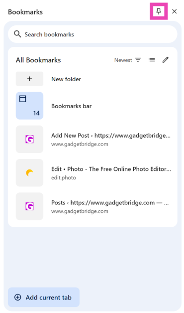 Cliquez sur les points de suspension sur Chrome, accédez àFavoris et listes>Afficher tous les favoris, puis cliquez sur l'icône en forme d'épingle en haut.