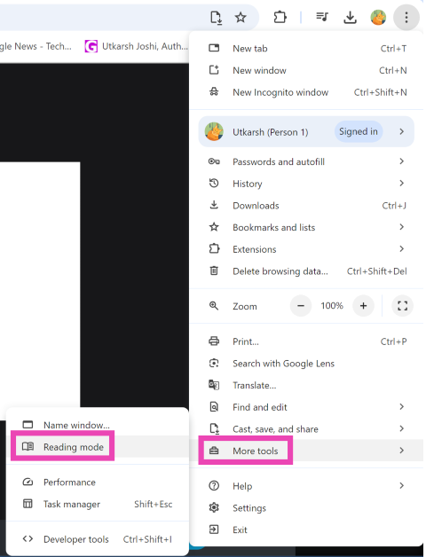 Étape 4 :Cliquez sur leellipsesencore une fois et allez àPlus d'outils>Mode lecture.