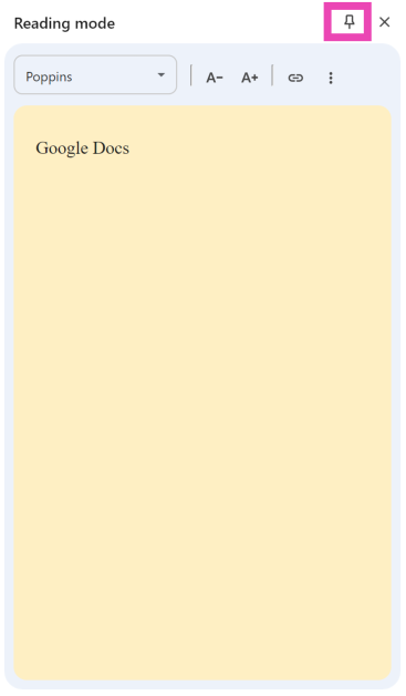 Ouvrez Chrome, cliquez sur les points de suspension, accédez àPlus d'outils>Mode lecture, et appuyez sur l'icône d'épingle.