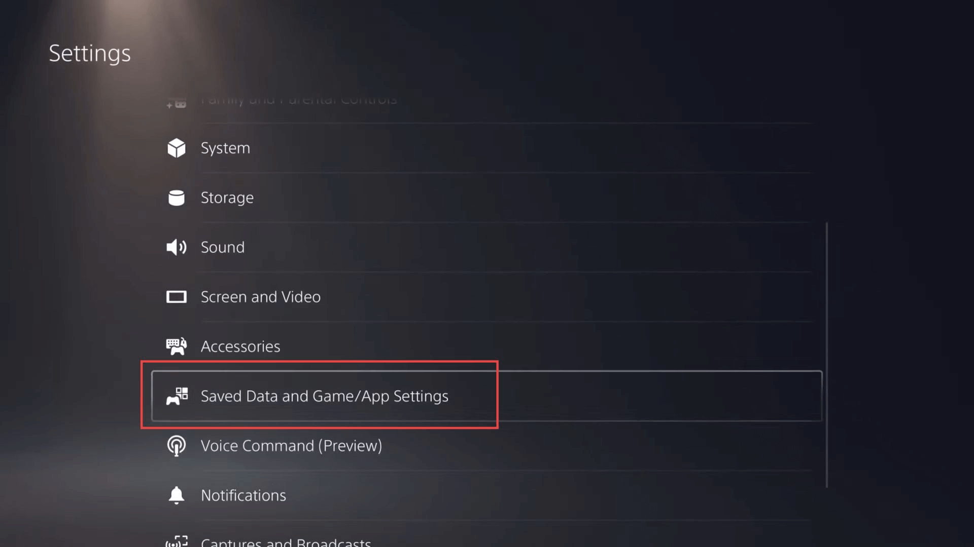 Étape 2– sur l’écran d’accueil, accédez àParamètres. Faites ensuite défiler les paramètres jusqu'à ce que vous trouviez leParamètres de l'application de sauvegarde des données dans le jeuoption. Sélectionnez-le en appuyant sur le bouton approprié de votre manette.