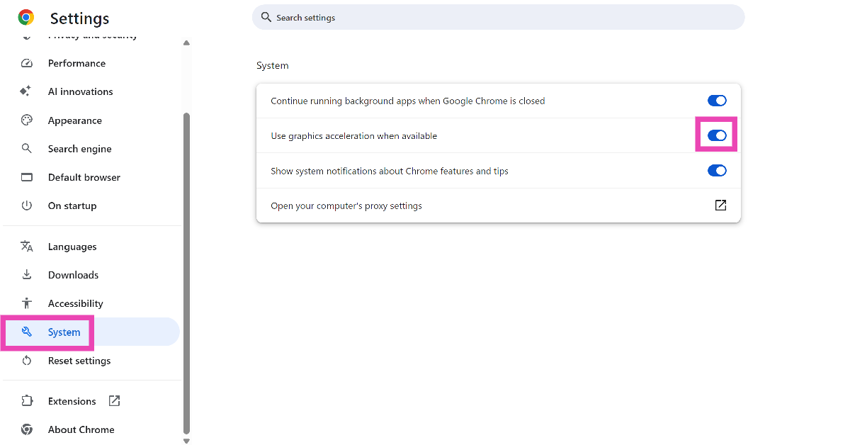 Aller àParamètres>Systèmeet activez l'interrupteur à bascule à côté de « Utiliser l'accélération graphique lorsqu'elle est disponible ».