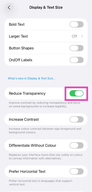 Aller àParamètres>Accessibilité>Affichage et taille du texteet activez l’interrupteur à bascule à côté de « Réduire la transparence ».