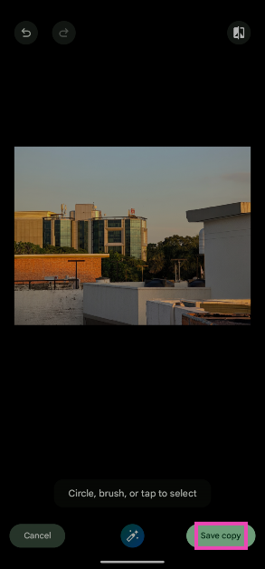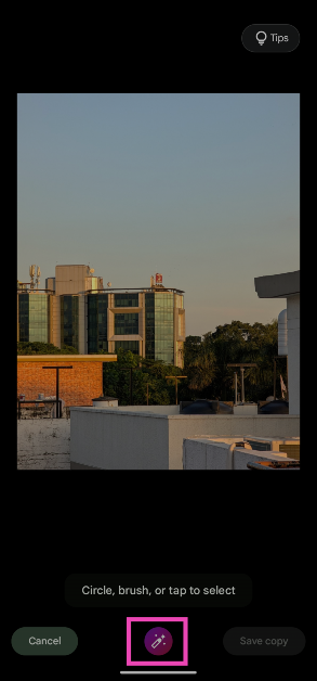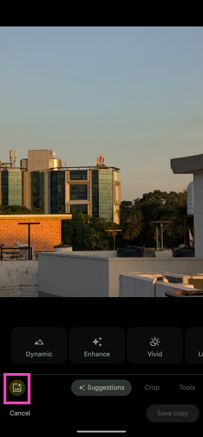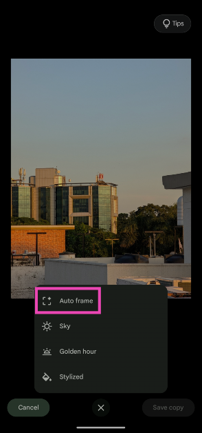 L'outil Cadre automatique fait partie de Magic Editor. Pour y accéder, ouvrez une image dans l'application Photos, appuyez sur « Modifier », appuyez sur l'icône Magic Editor dans le coin inférieur gauche de l'écran et appuyez sur l'icône de suggestions en bas.