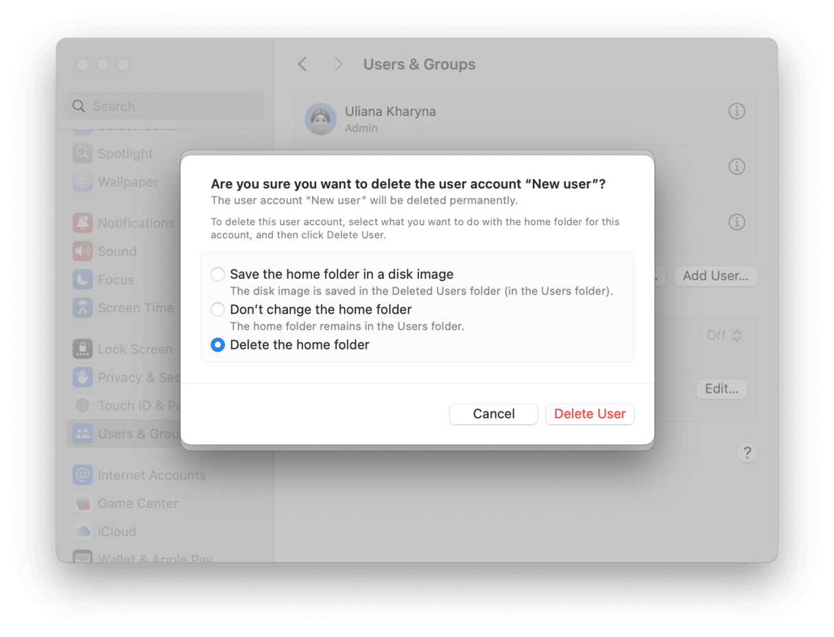 - S'il y a un profil que vous n'avez pas créé, cliquez sur un i à côté et sélectionnez Supprimer le compte. Sélectionnez Supprimer le dossier personnel dans la fenêtre contextuelle.