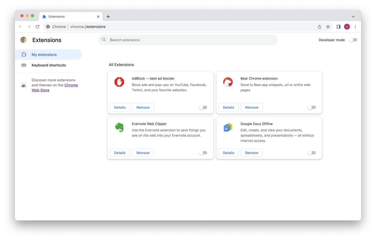 Recherchez parmi vos extensions dans la fenêtre et cliquez sur Supprimer sur celles que vous ne reconnaissez pas.