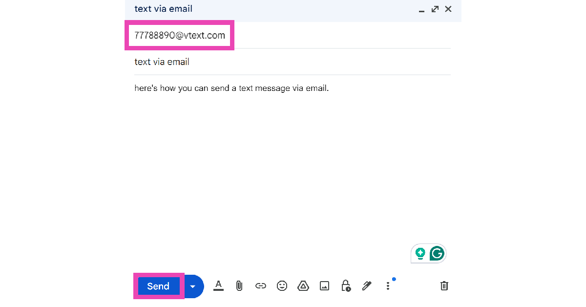 Étape 2 :Dans le champ Adresse du destinataire, saisissez l'adresse du destinataire.numéro de téléphonesuivi de la passerelle SMS de leur fournisseur de services. Par exemple, la passerelle SMS pour Verizon estvtext.com. Pour AT&T, la passerelle esttxt.att.net. Si le numéro du destinataire est « 7778889990 », saisissez7778889990@vtext.com dans le champ d’adresse du destinataire.