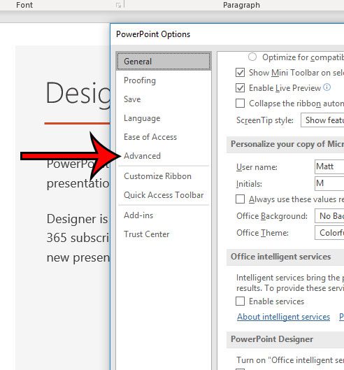 Étape 4 : Sélectionnez leAvancéonglet sur le côté gauche duOptions PowerPointfenêtre.