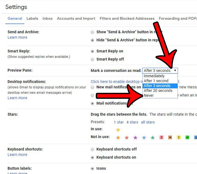 Étape 3 : faites défiler jusqu'àVolet d'aperçuélément et cliquez sur le menu déroulant à droite deMarquer une conversation comme lue, puis choisissez leJamaisoption.