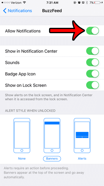 Étape 4 : Appuyez sur le bouton en haut de l'écran, à droite deAutoriser les notifications. L'ombrage vert autour du bouton disparaîtra une fois que vous aurez appuyé sur ce bouton. Si vous préférez conserver certaines notifications, vous pouvez personnaliser les autres options sur cet écran.