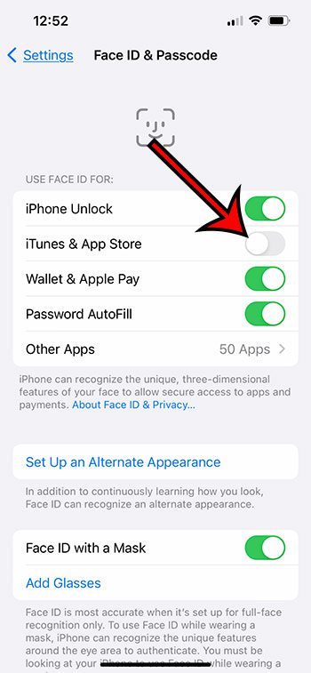 Étape 4 : Éteignez leiTunes et App Storeoption sousUtiliser Face ID pour.