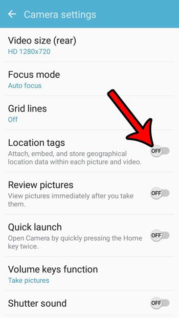 Étape 3 : Appuyez sur le bouton à droite deBalises de localisation. Quand ce bouton ditDésactivé, comme c'est le cas dans l'image ci-dessous, l'appareil photo de votre téléphone Android ne joindra plus, n'intégrera et ne stockera plus de données géographiques avec l'image.